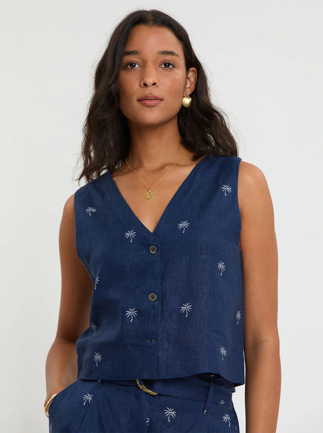 This versatile shell tank features a clean, sleeveless design with a flattering fit. Worn on its own or layered as a vest, it offers a playful touch with its button-back detail and a slightly cropped hem for effortless styling.