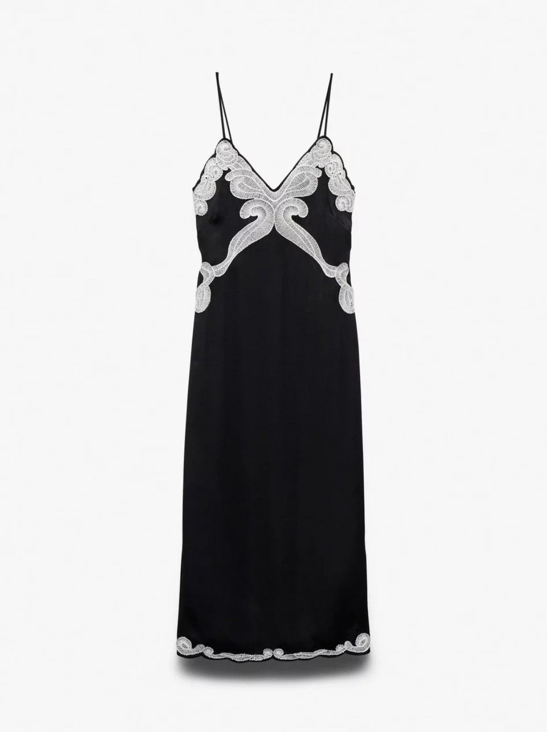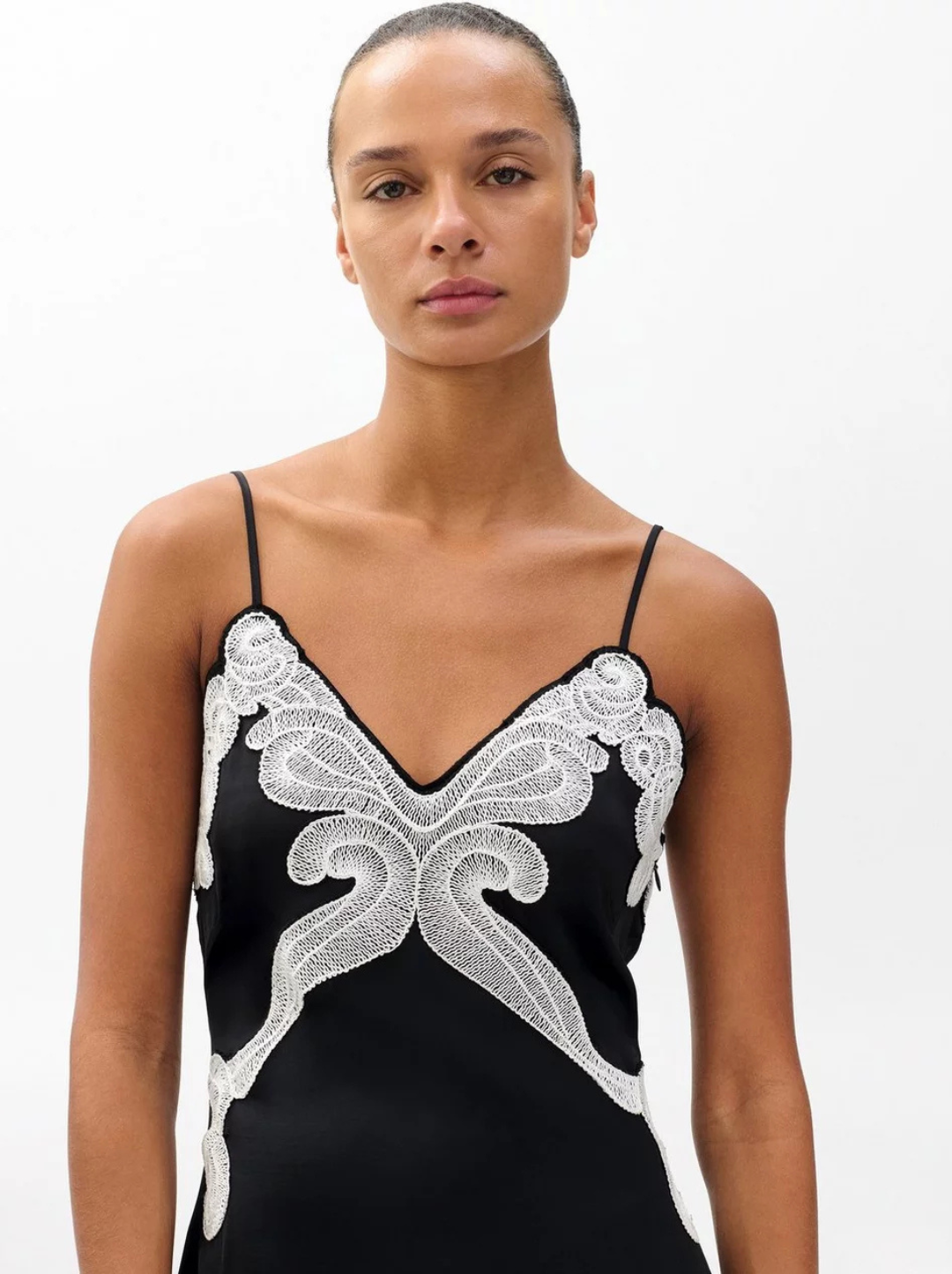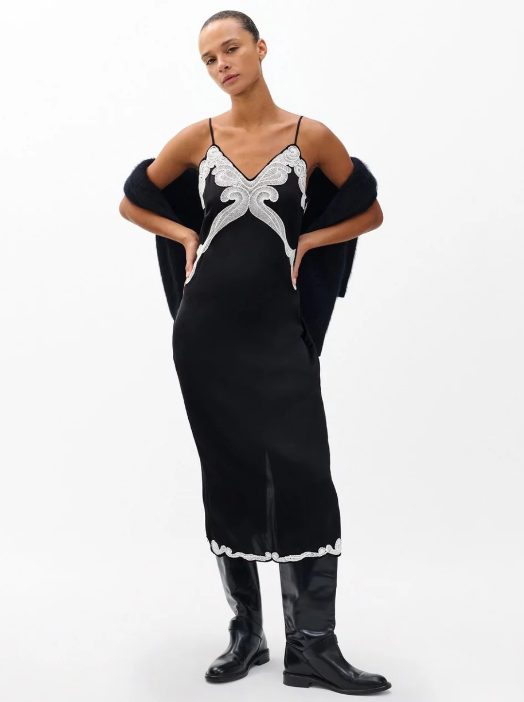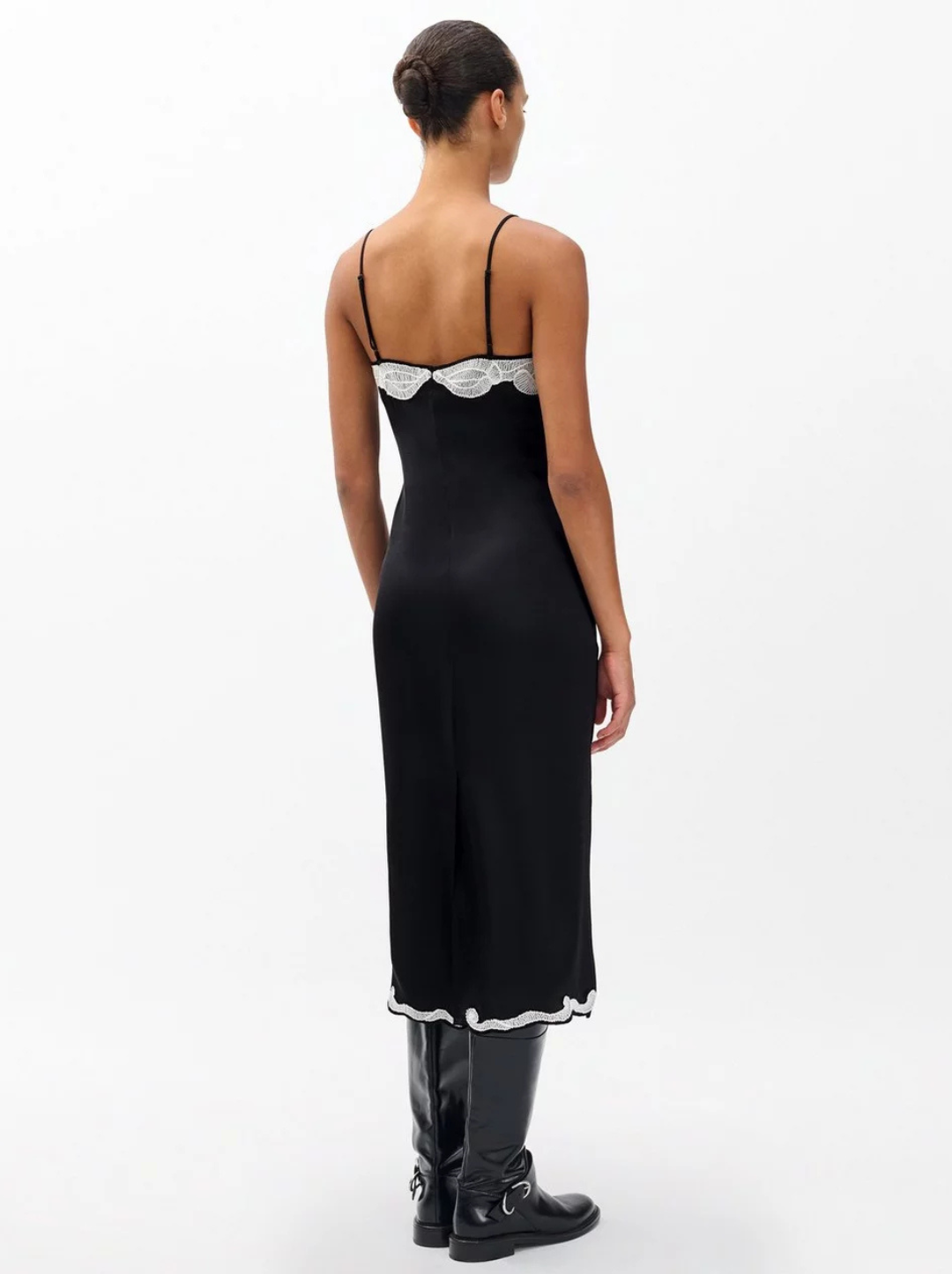 A slip with some attitude. This twist on the classic silhouette is cut from lightweight satin that moves like liquid and is trimmed with custom lace embroidery at the bodice and hem. The midi length hits just right to wear with heeled sandals or high boots.