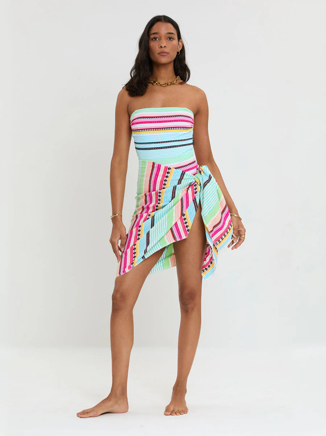 This sarong is designed to be worn a number of ways: as a scarf around the neck; a cover-up around tie around the chest; a pareo tied around the waist or laid flat as a beach blanket, this versatile style is a beach wear essential.