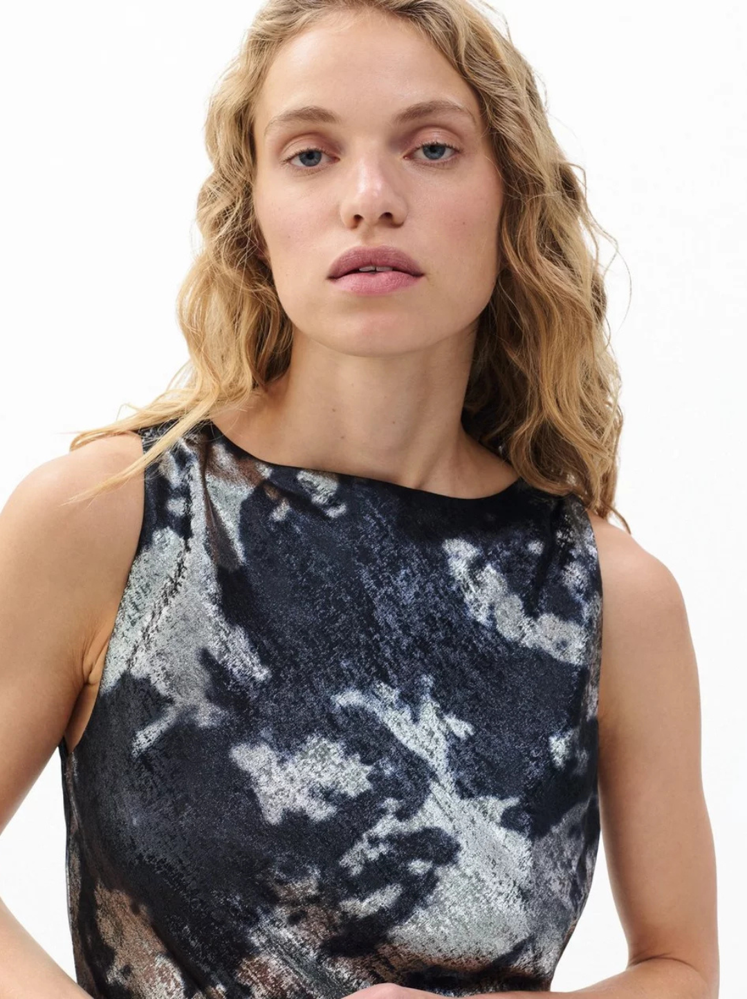 Moody moment. A bias cut with a slim fit, this midi dress is a simple silhouette that makes a mysterious statement with its painterly, abstract design and subtle luster. Falling above the ankle, this high-neck style features a high side slit to showcase whatever boots, heels, or flats you choose to pair with it.
