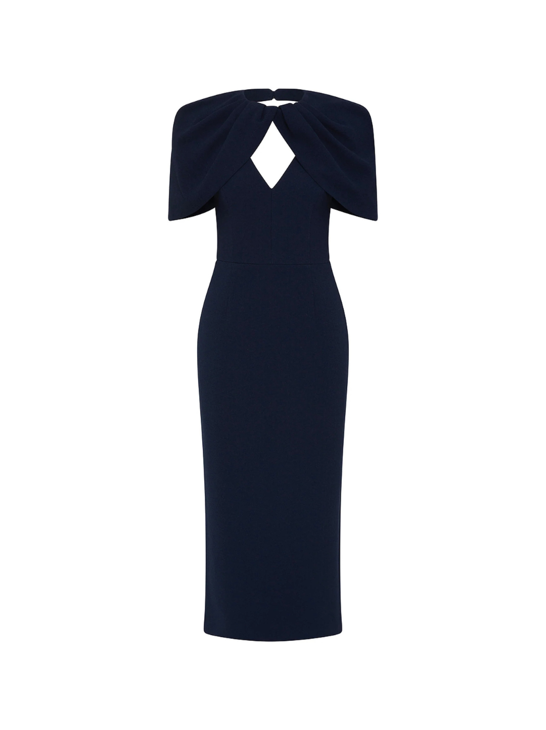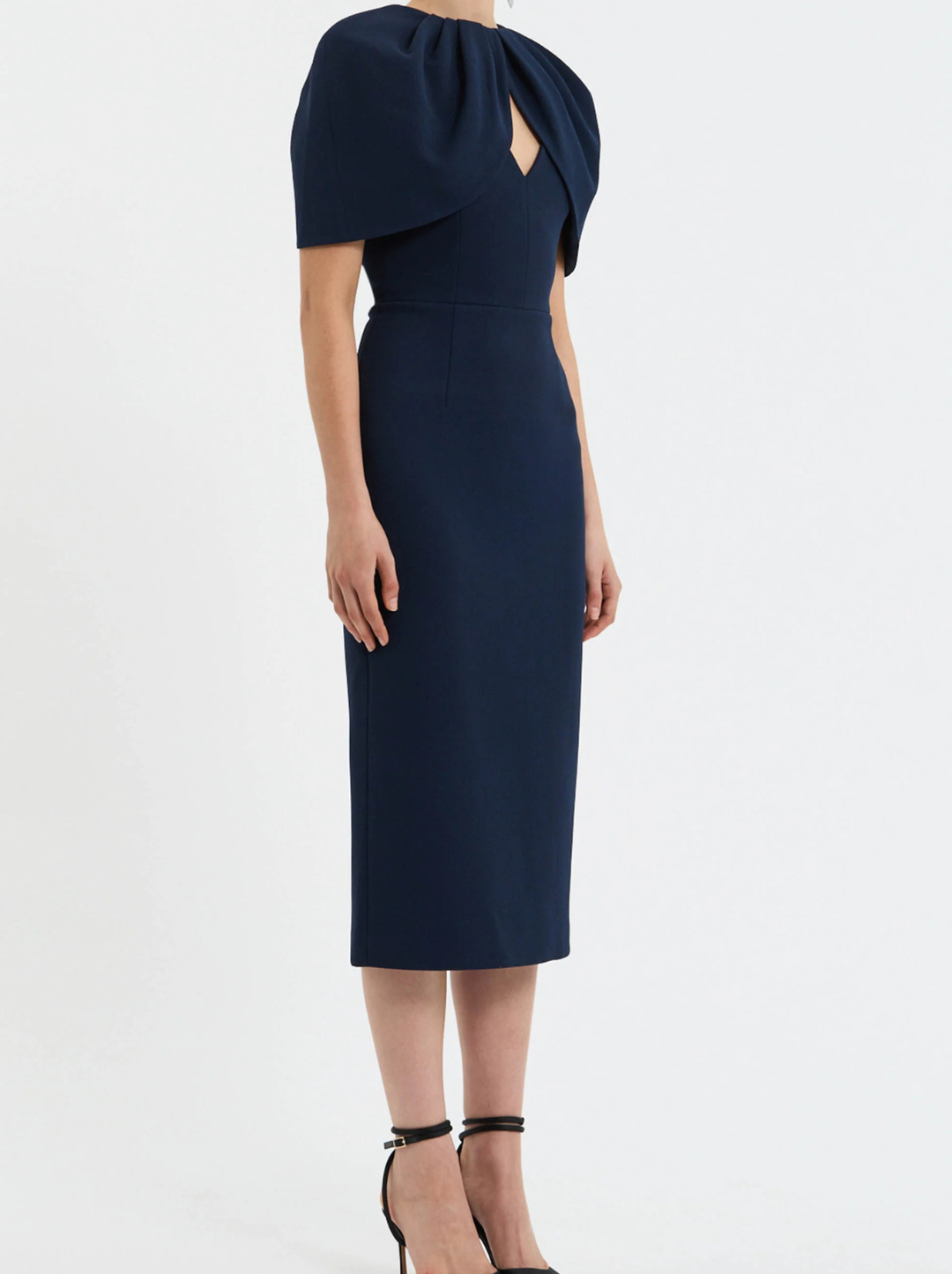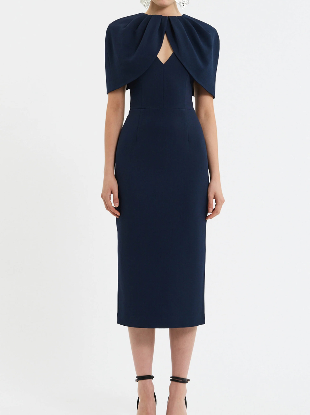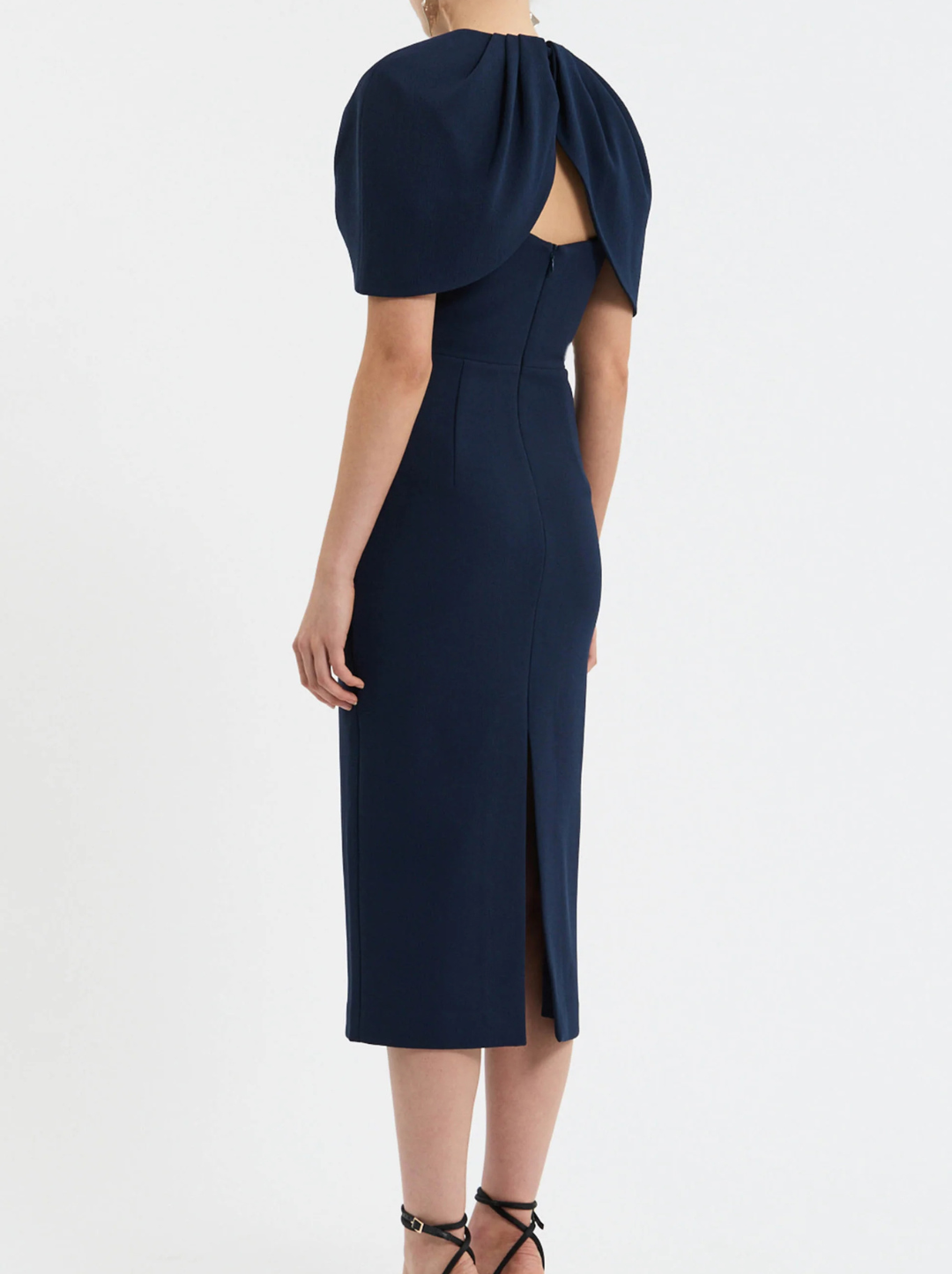 The Xena Midi Dress in navy epitomises timeless sophistication. Tailored from bonded crepe, its draped cape overlay and V neckline seamlessly blend with the fitted bodice detailed with princess seams. Cinched at the waist, the pencil midi skirt sculpts an elegant silhouette, elevated by a back split. Secured with a back zip fastening and complete with lining, this versatile dress is perfect for your next event.